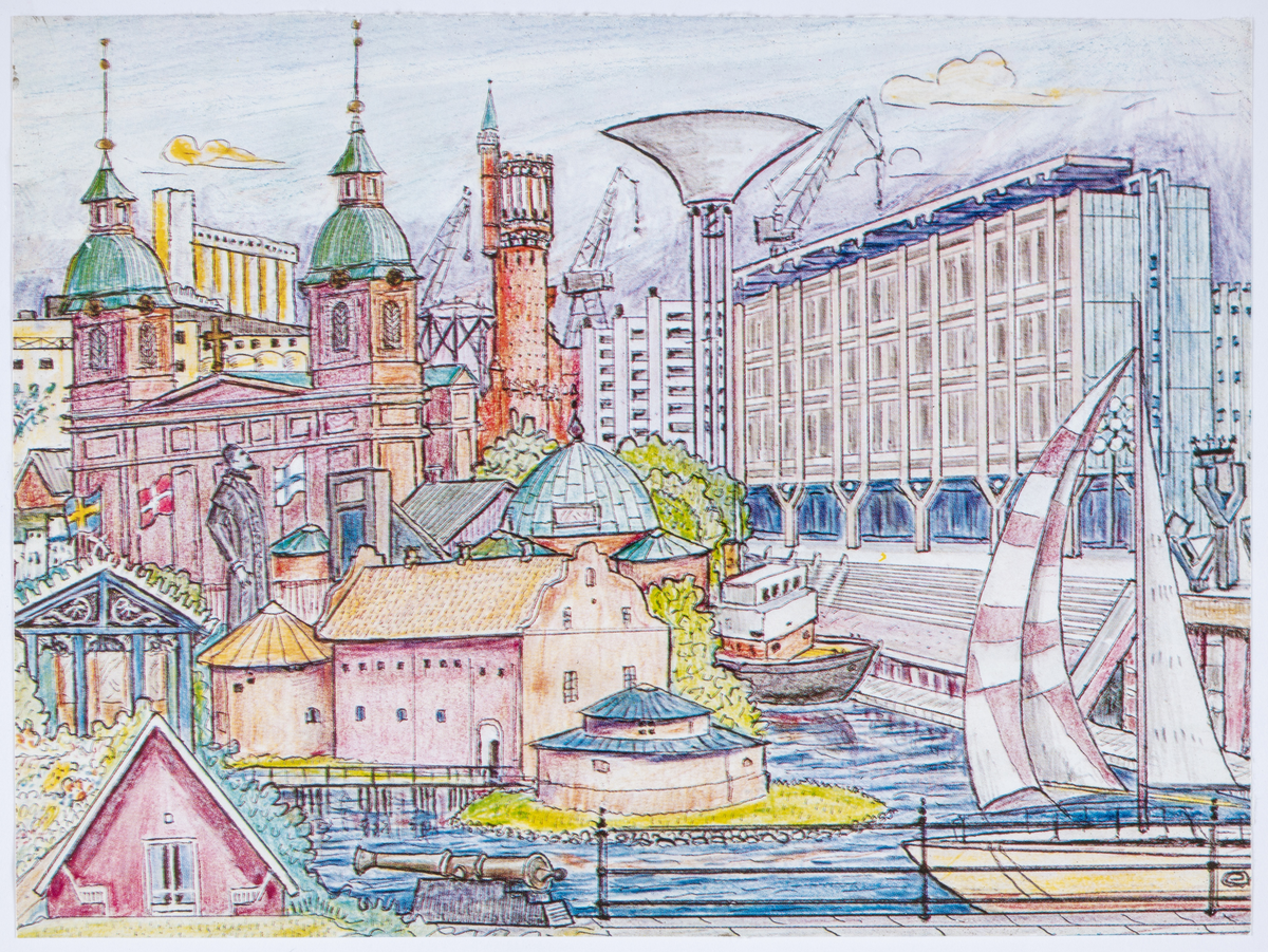 Föreställer byggnader från Landskrona, bl a citadellet, kyrkan och vattentornet m.fl. byggnader.