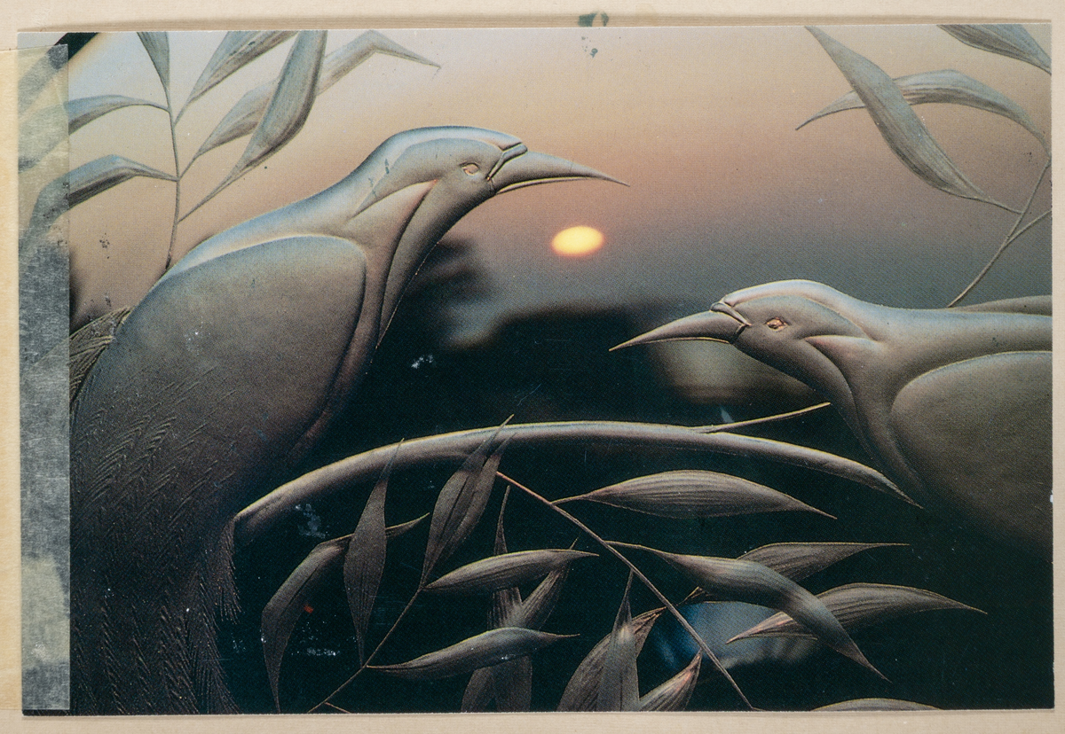Två graverade fåglar i lövverk, trol. dekor på skål, eller vas.