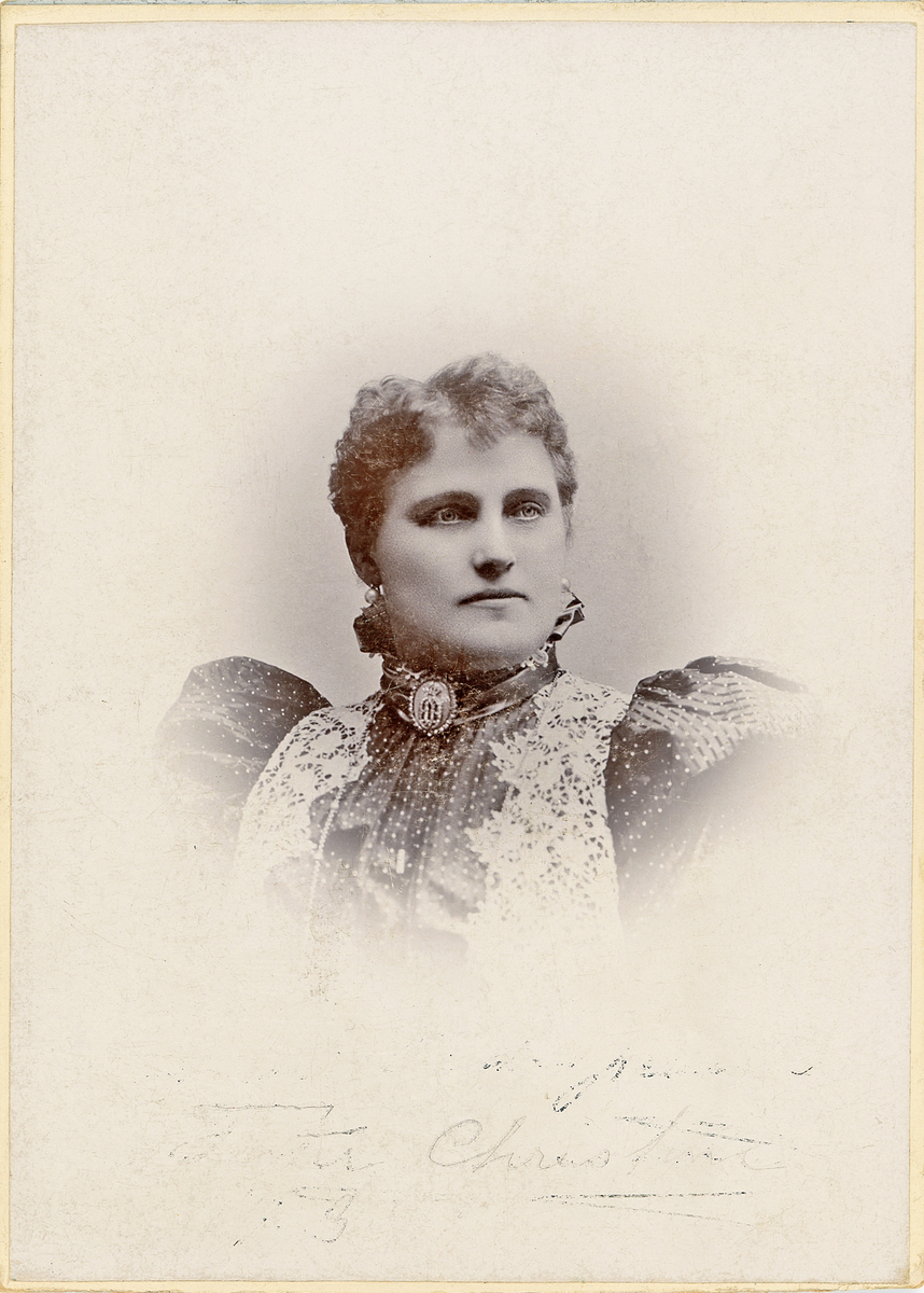 Operasångerskan Christina Nilsson i mörk, prickig klänning med ljusa spetsgarneringar och hög krage.