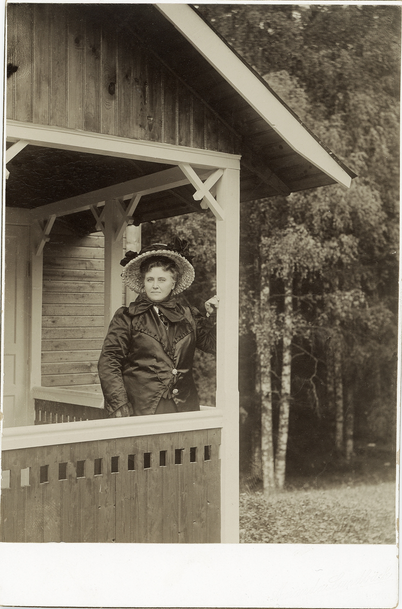Operasångerskan Christina Nilsson i mörk sidendräkt och ljus hatt. Hon står på verandan till ett enkelt rödmålat hus med