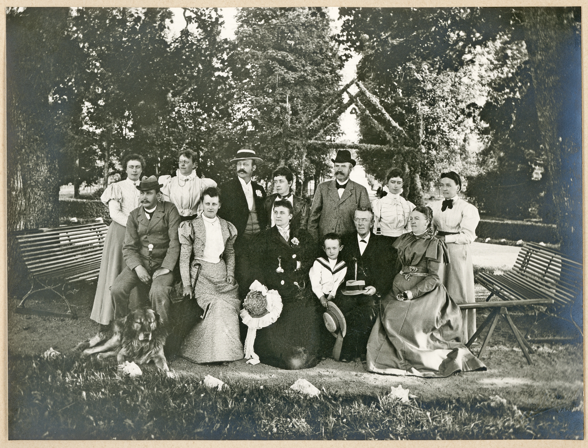 Bakre raden fr. v.: okänd, fröken Fredrika Schander (?), godsägare Johannes Nilsson, fru Anna Nilsson (f. Schander), fil.dr. Nils Sjöstrand (?), fru Gustava Maria Sjöstrand, f. Schander (?), okänd.