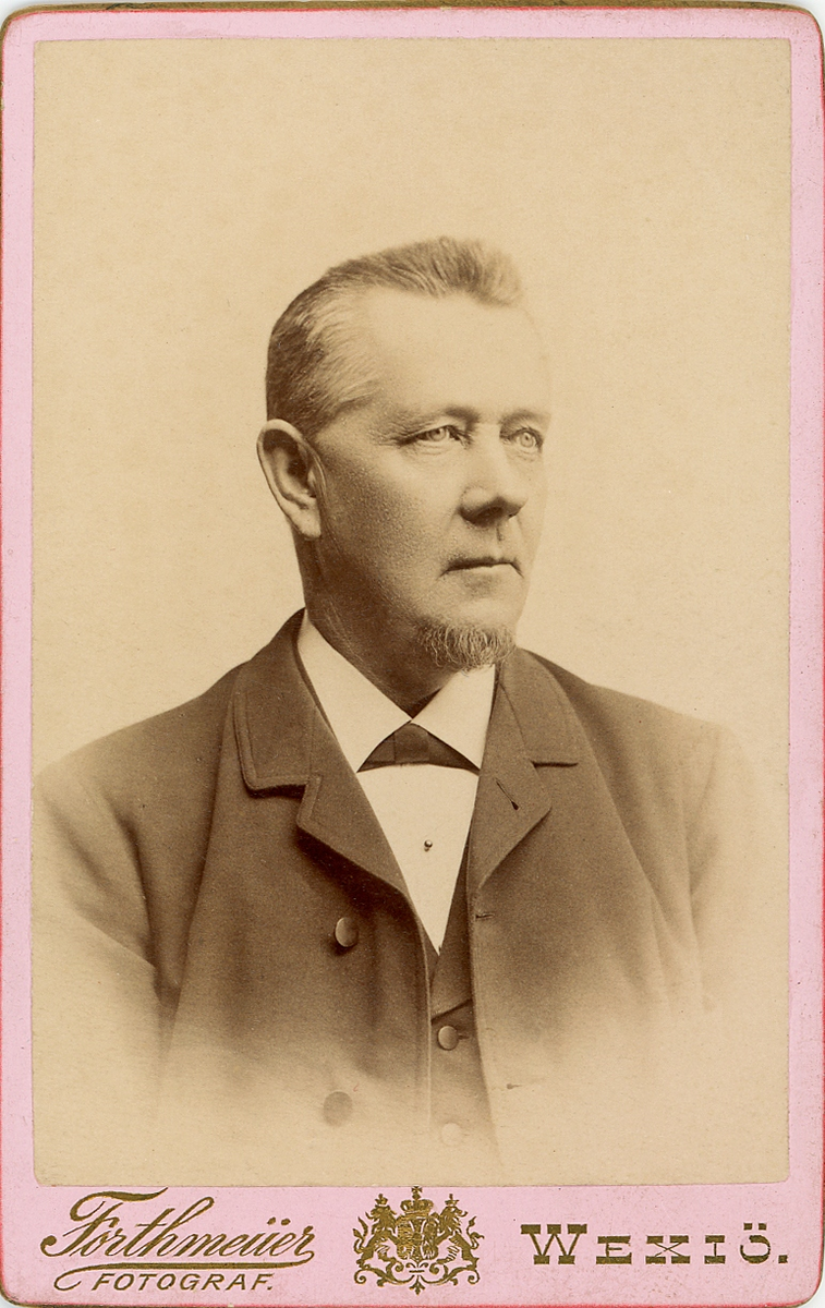 Handlanden och fabrikören m.m. Carl Schander, Växjö, i mörk kostym med väst, stärkkrage och fluga.