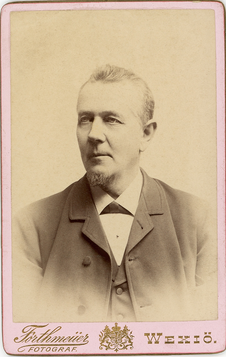 Handlanden och fabrikören m.m. Carl Schander, Växjö, i mörk kostym med väst, stärkkrage och fluga.