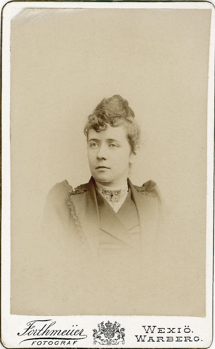 Fröken Anna Schander i mörk, höghalsad dräkt med vit blus. I halsgropen syns ett s.k. halslås av silver (allmogesmycke).