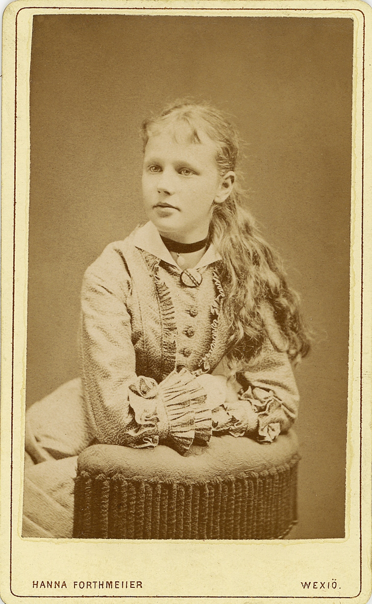 Fröken Clara Schander som tonåring, i ljus klänning med vit krage, med en brosch i halsgropen. Runt halsen syns ett mörkt sammetsband med medaljong. Hon lutar armarna mot ryggstödet till en stoppad stol med frans.