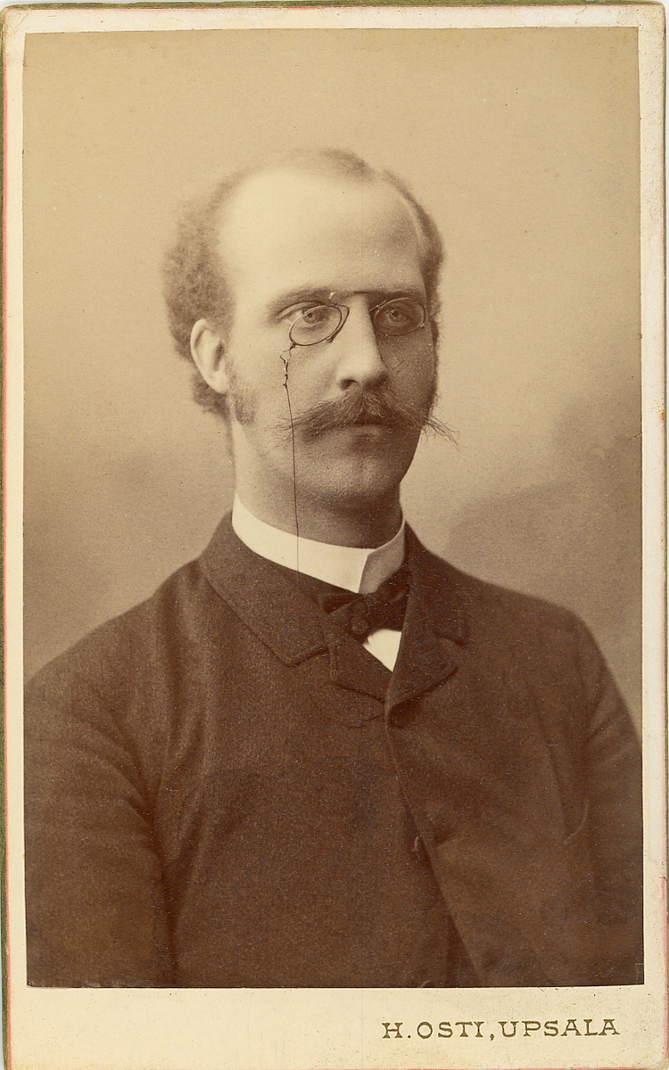 Johannes Nilsson, klädd i mörk kostym med stärkkrage, fluga och pincené.
