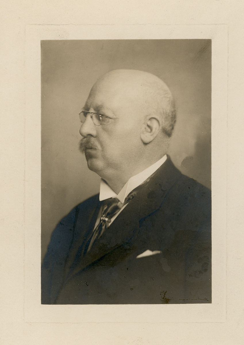Vice häradshövdingen och godsägaren Johannes Nilsson, Gårdsby, klädd i mörk kostym med stärkkrage, slips och pincené.