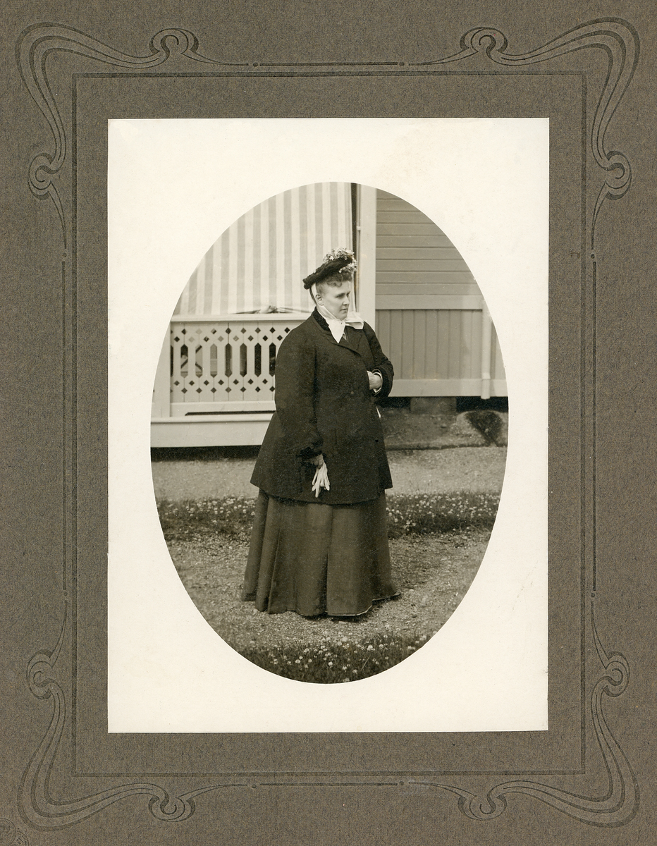 Operasångerskan Christina Nilsson poserar i promenaddräkt och hatt utanför ett av husen på Loka brunn, 1907.