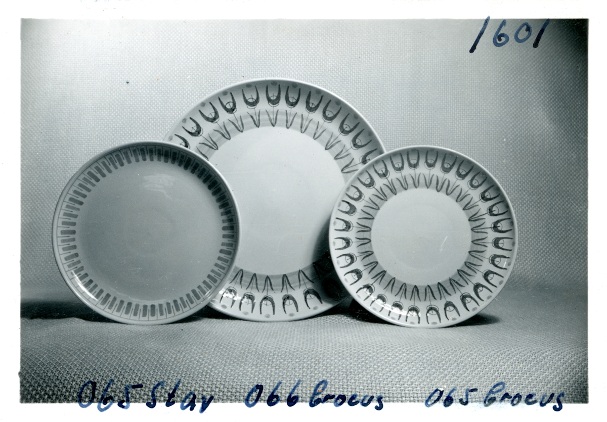 Assietter 065 samt fat 066 i dekor "Star och Crocus" från Bo Fajans, formgivare Berit Ternell, omkring 1900-talets mitt.