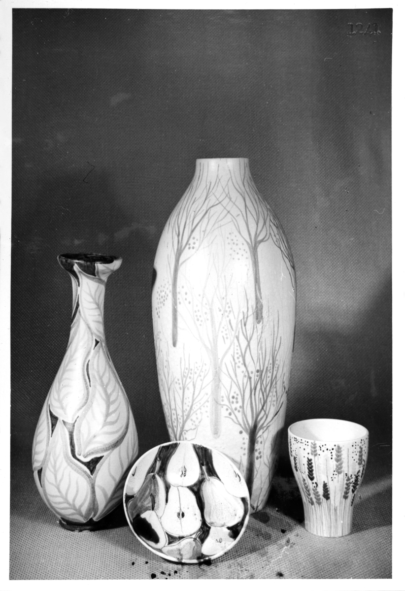 Vaser (bland annat golvvasen "Vår") och ett fat från Bo Fajans, formgivare Maud Fredin-Fredholm, omkring 1900-talets mitt.