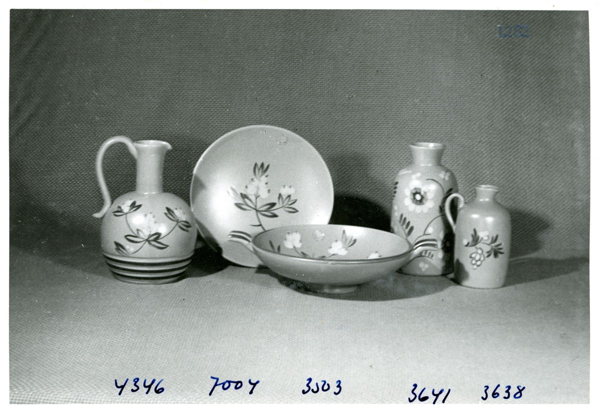 Likörkrus, fat, skål samt mindre krus i ljusgrå matt konstglasyr med blå och vit dekor från Bo Fajans, formgivare Eva Jancke-Björk, omkring 1900-talets mitt.