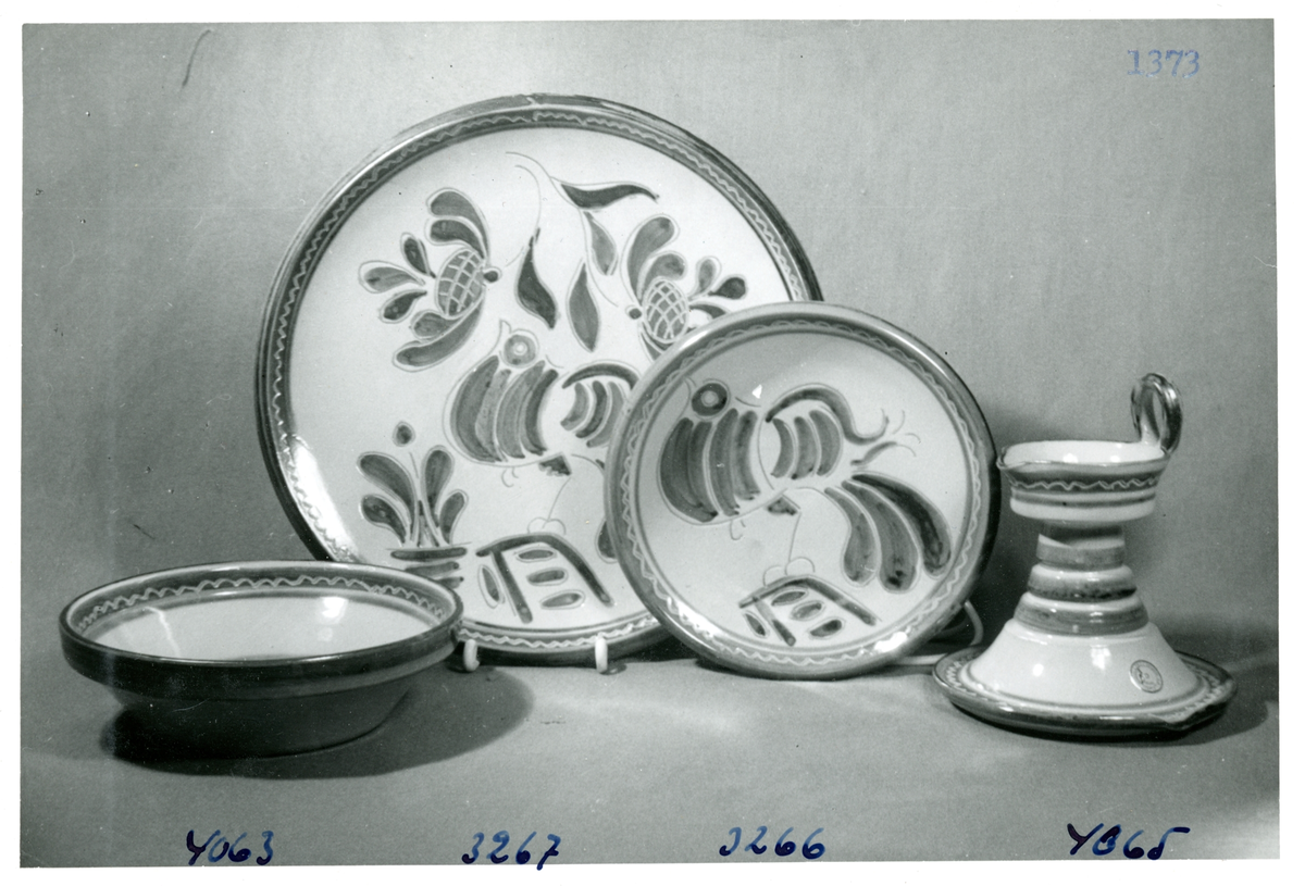 Skål, fat, assiett samt ljusstake från Bo Fajans, formgivare Eva Jancke-Björk, omkring 1900-talets mitt.