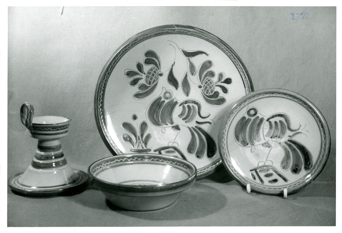 Ljusstake, skål, fat och assiett från Bo Fajans, formgivare Eva Jancke-Björk, omkring 1900-talets mitt.