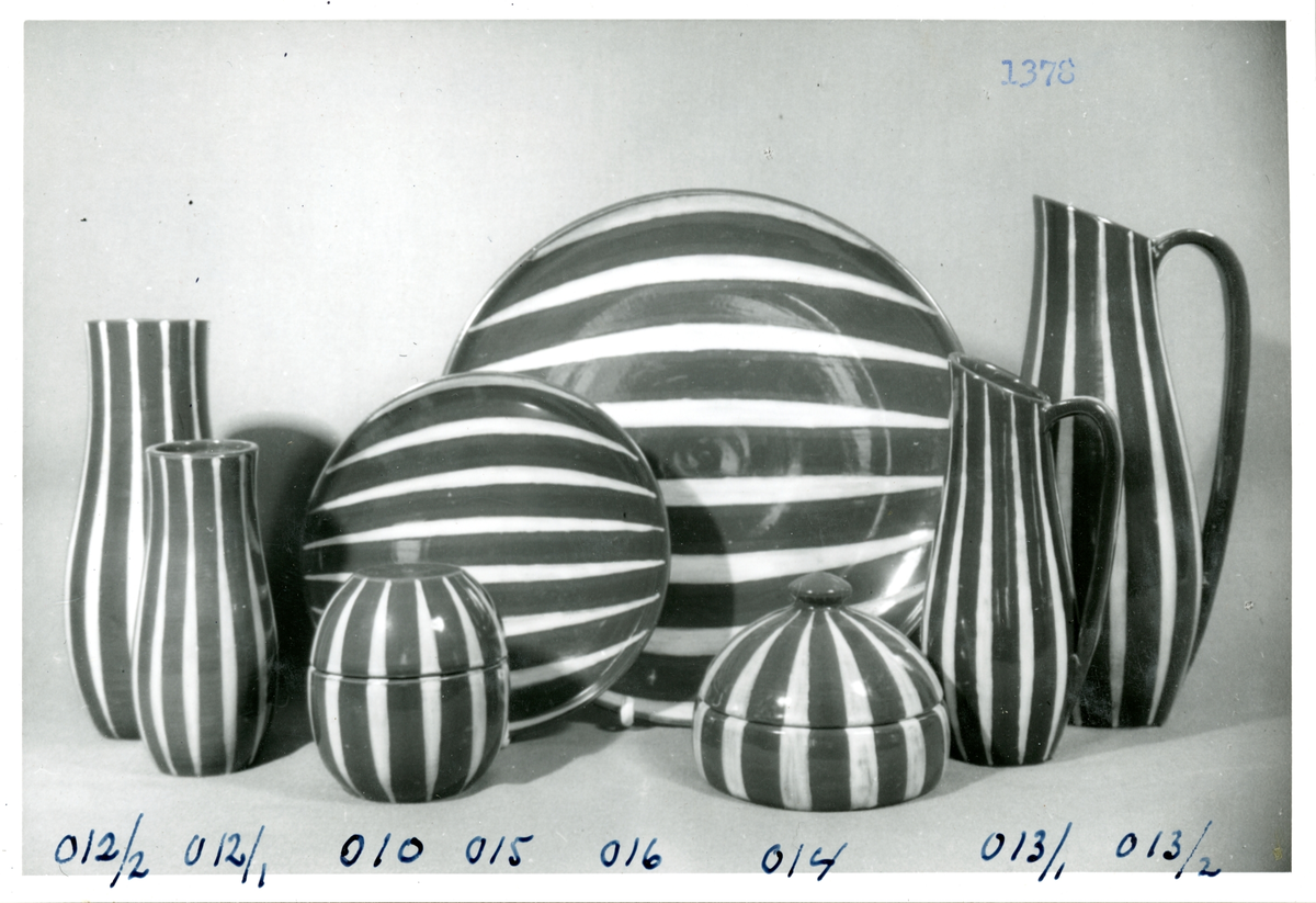 Vas, cigarettburk, assiett, fat, puderburk samt krus från Bo Fajans, formgivare Berit Ternell, omkring 1900-talets mitt.