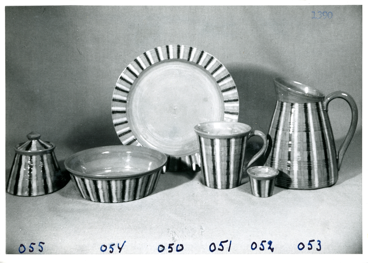 Servis från Bo Fajans, formgivare Berit Ternell, omkring 1900-talets mitt. Marmeladburk, skål, tallrik, mugg, äggkopp och kanna.