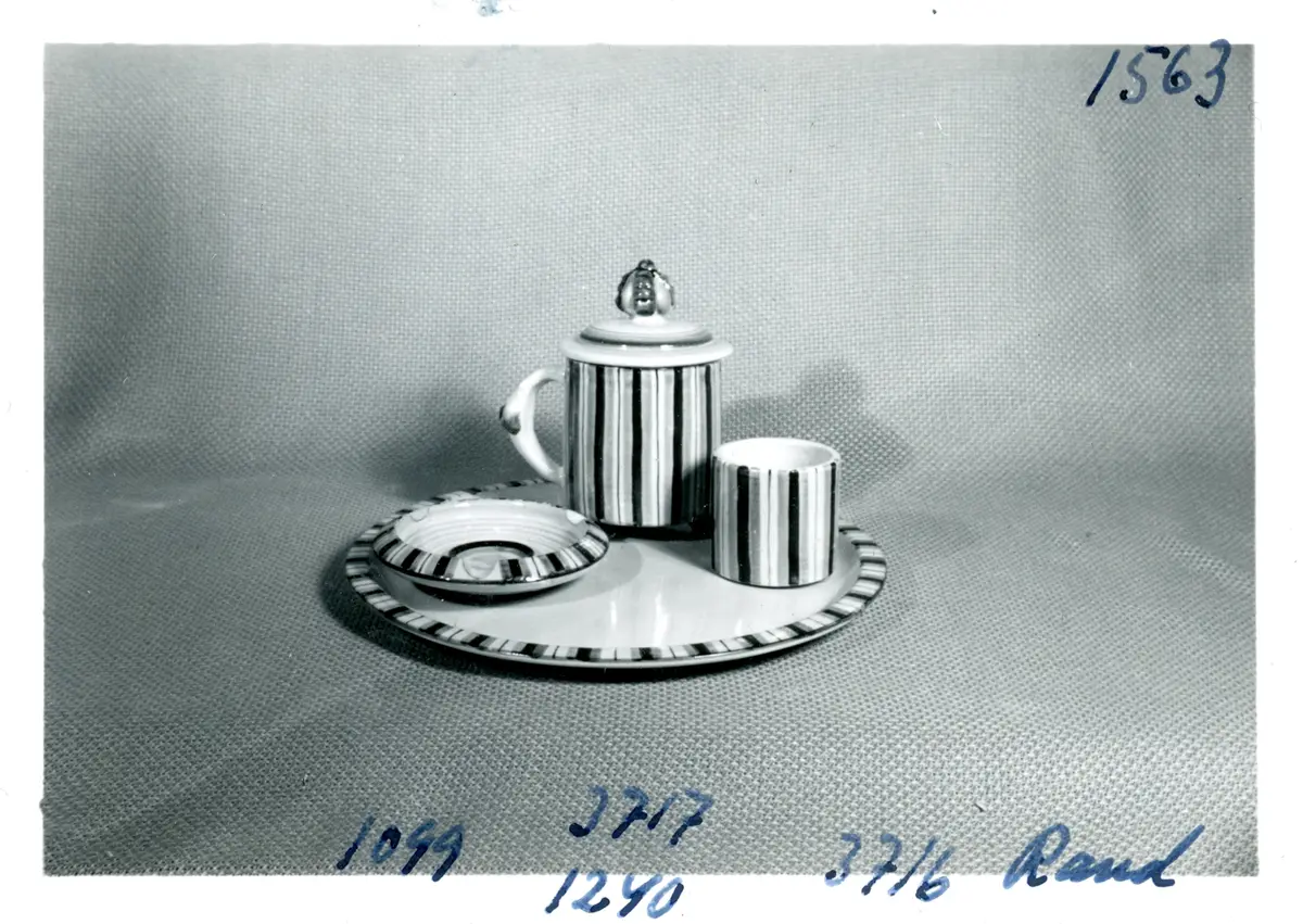 Bricka med assiett, kanna och mugg med dekor Rand från Bo Fajans, formgivna av Allan Ebeling och Eva Jancke-Björk, 1900-talets första halva.