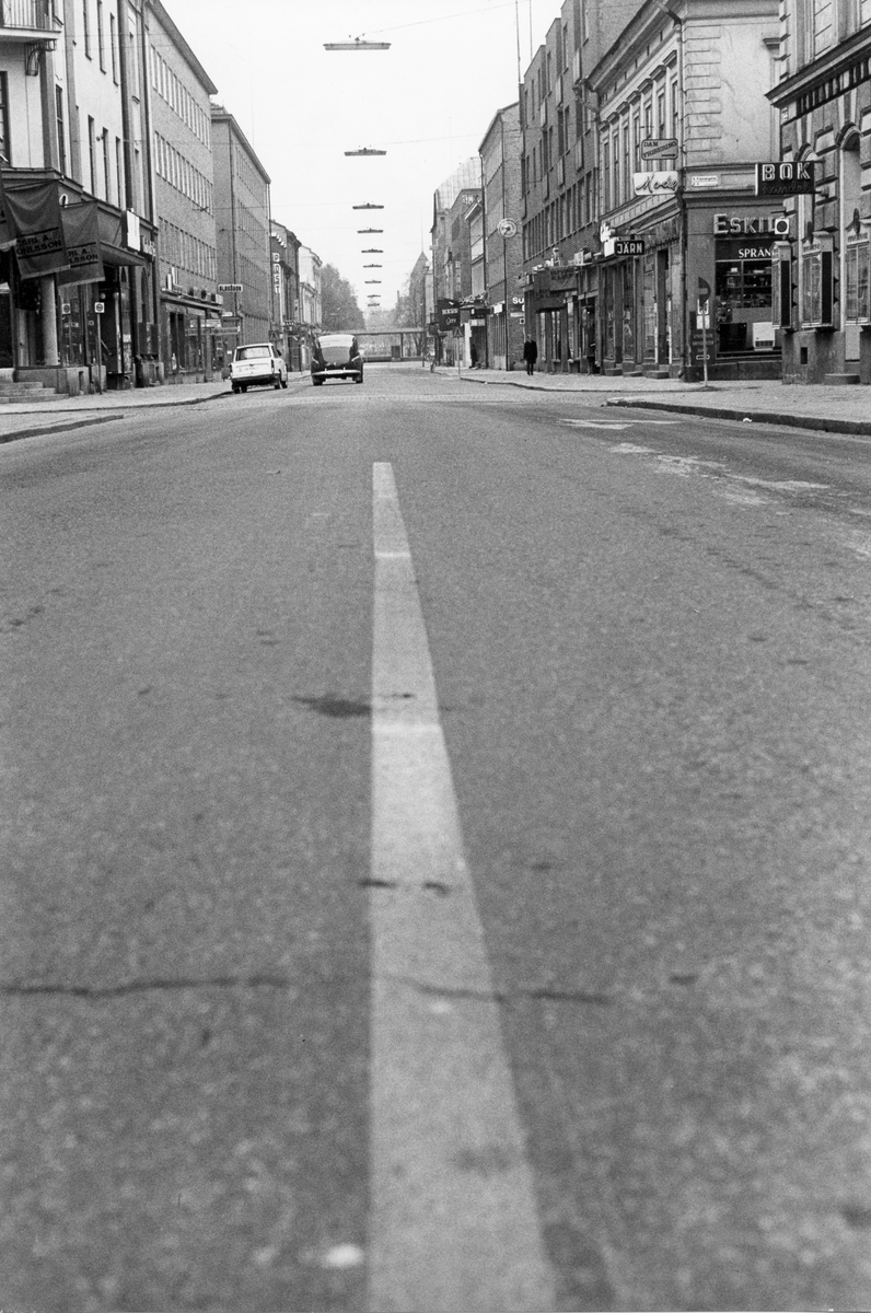 Söndagsmorgon. Drottninggatan mot Järnvägsstation, Gävle. Från utställningen "Gävlar i stan" på Gävle Museum 1967.