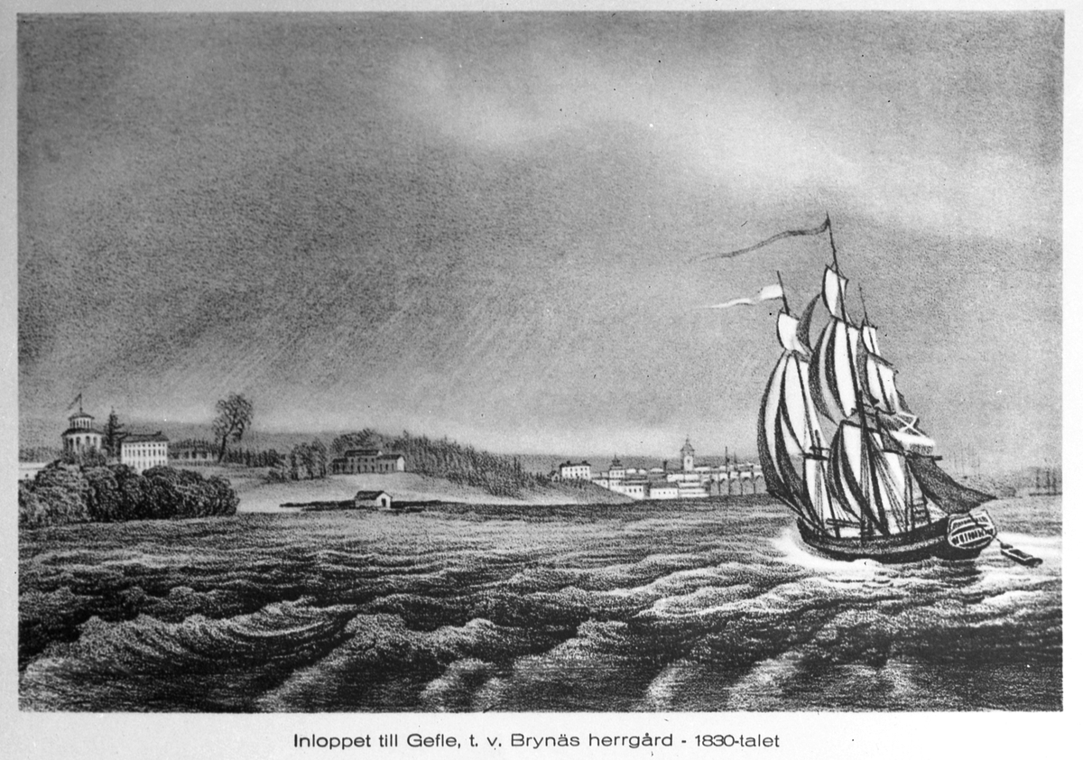 "Inloppet till Gefle. Till vänster Brynäs herrgård. -1830 talet".