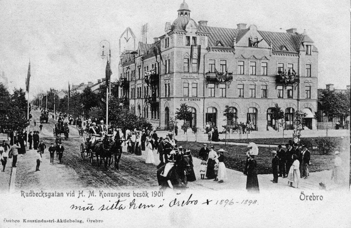 Rudbecksgatan vid H. M. Konungens besök 1901. Gustaf Reimers sista hem i Örebro. 1896 - 1898