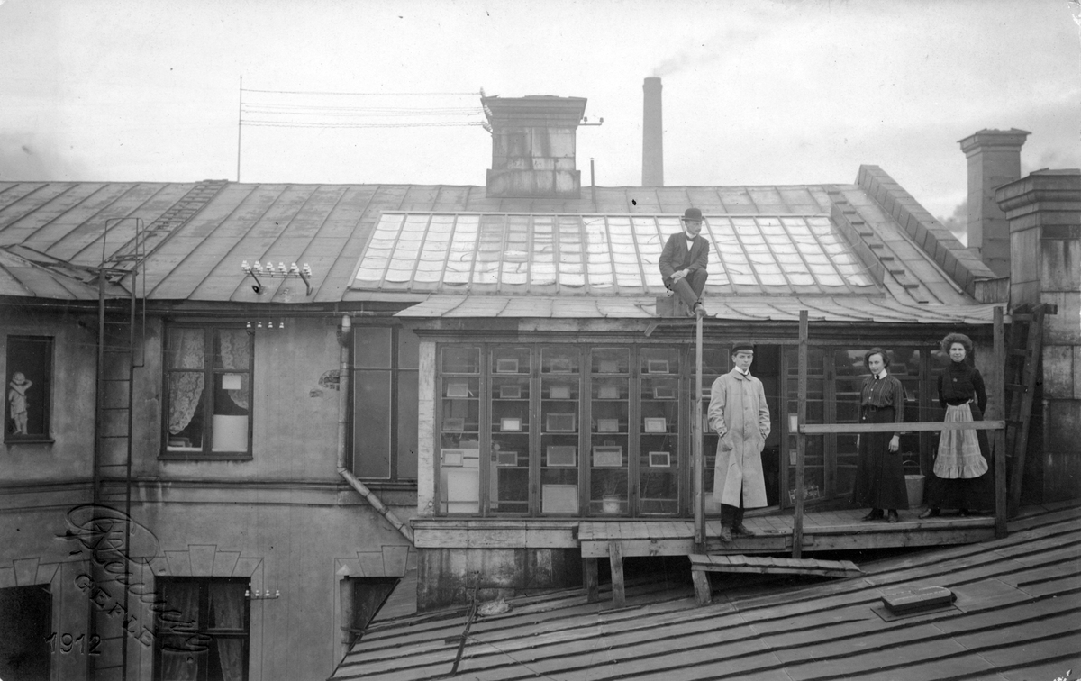 Gustaf Reimers fotoateljé. Vännen Josef Porrvik på taket de andra är hans biträden, Gunnar Hermansson, Lilly Gustafsson och Judit Sandin.