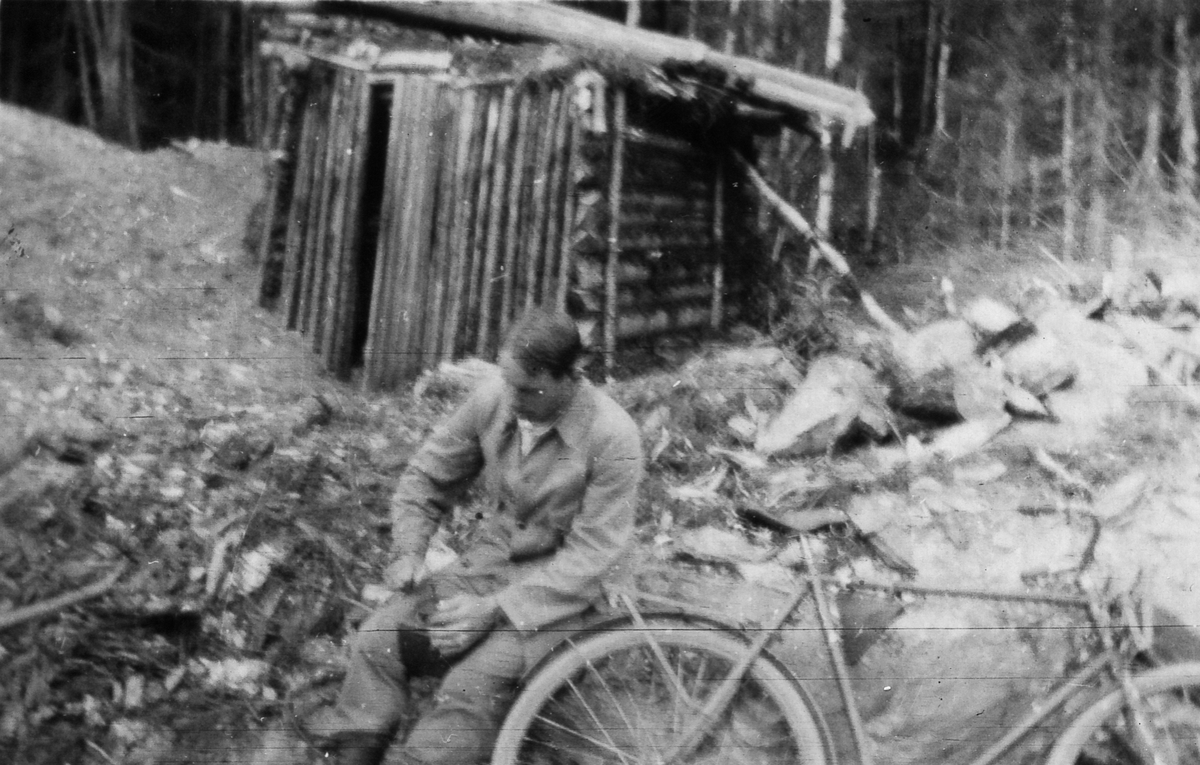 Man sitter i en skogsdunge bredvid en cykel och håller ett föremål i händerna. Bakom honom syns ett enkelt skjul omgivet av stubbar och skog.