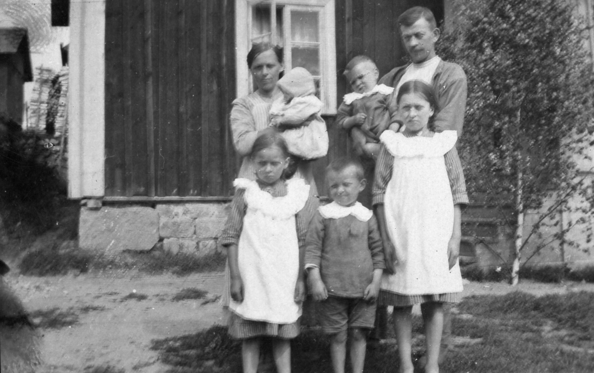En familj varav två vuxna och fem barn står framför ett trähus.
