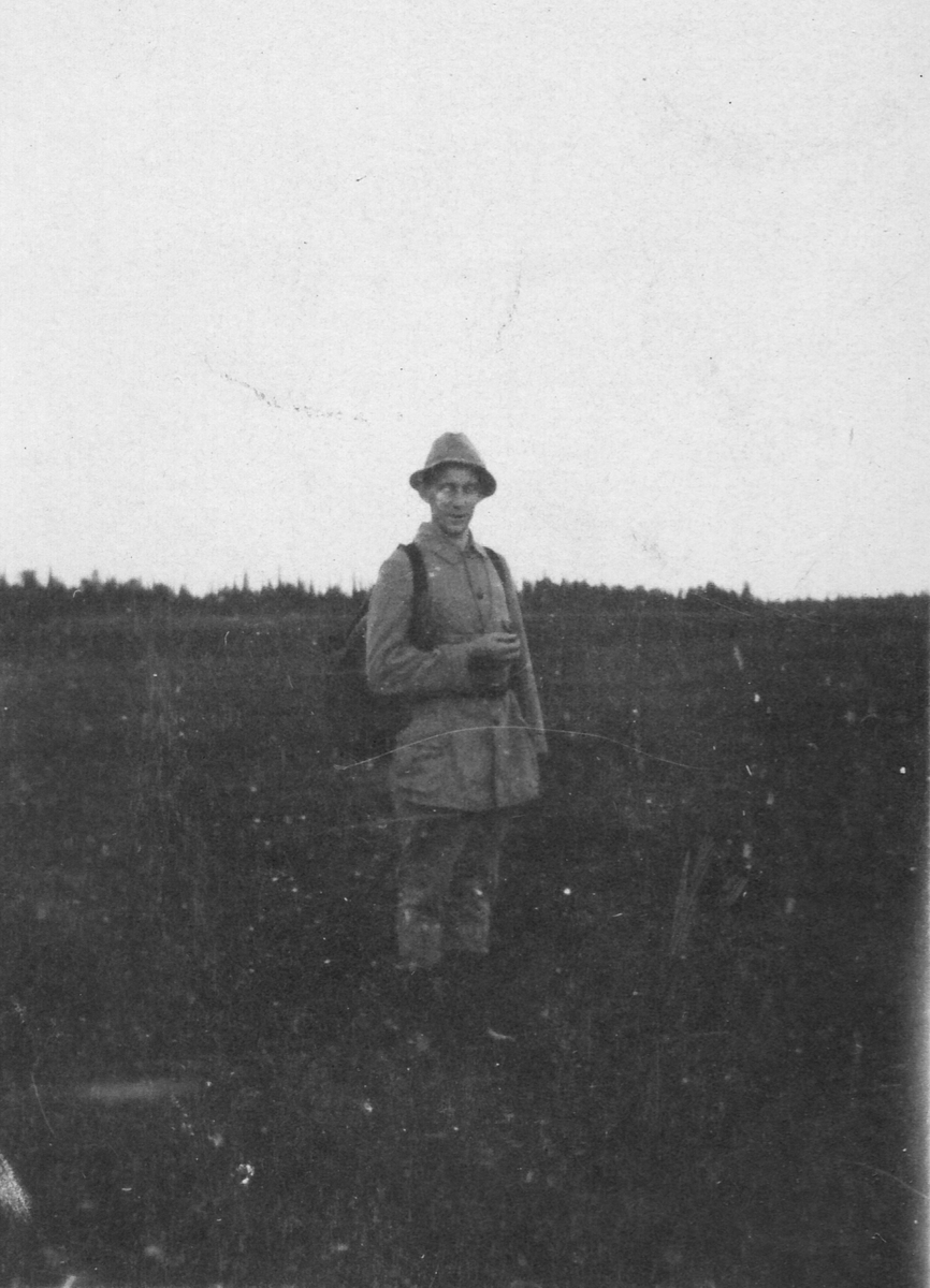 Man med ryggsäck i öppet landskap.