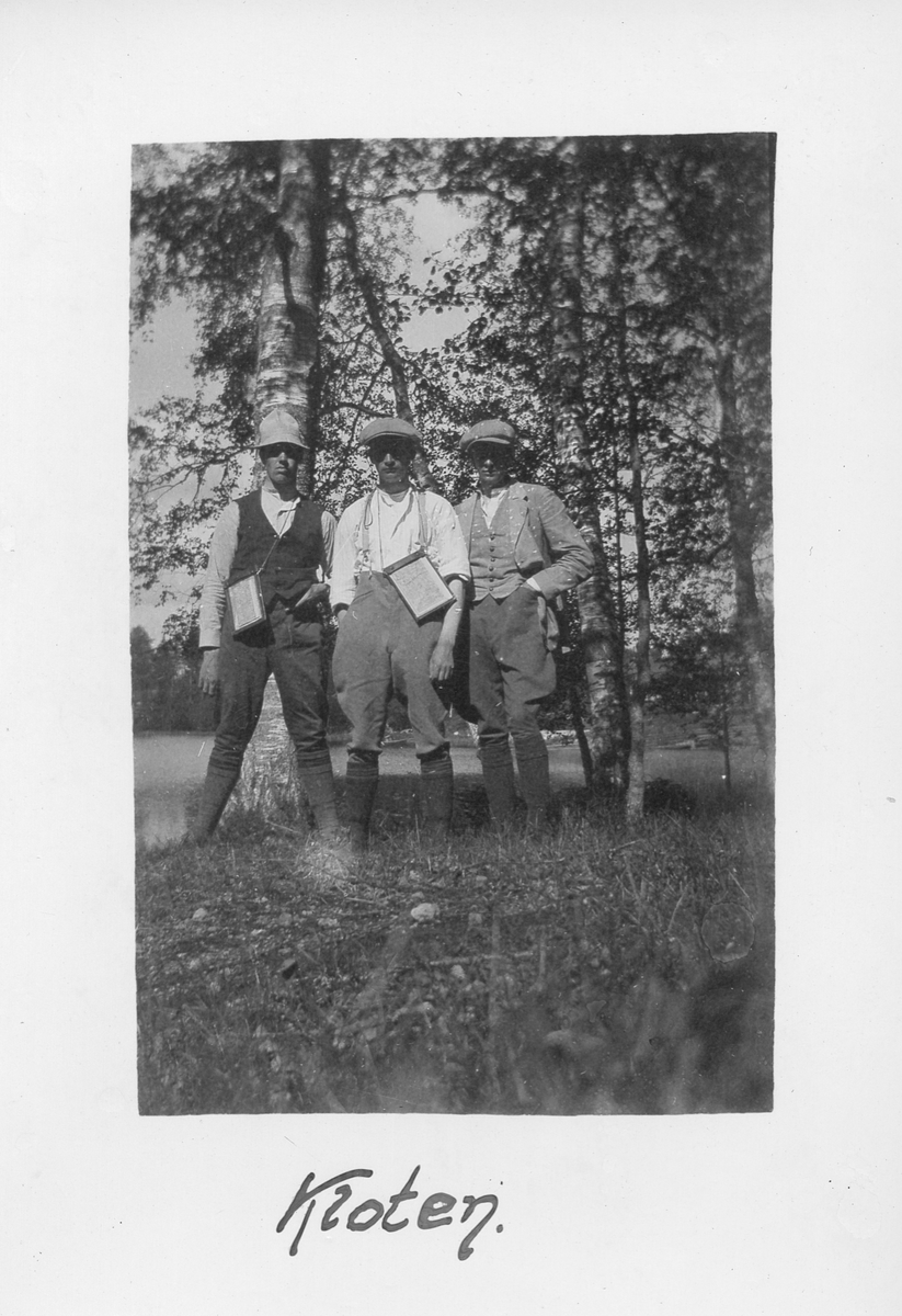 Foto av tre män i skogsmiljö. De står bredvid varandra i arbetskläder och hattar. Under bilden står texten "Kloten".