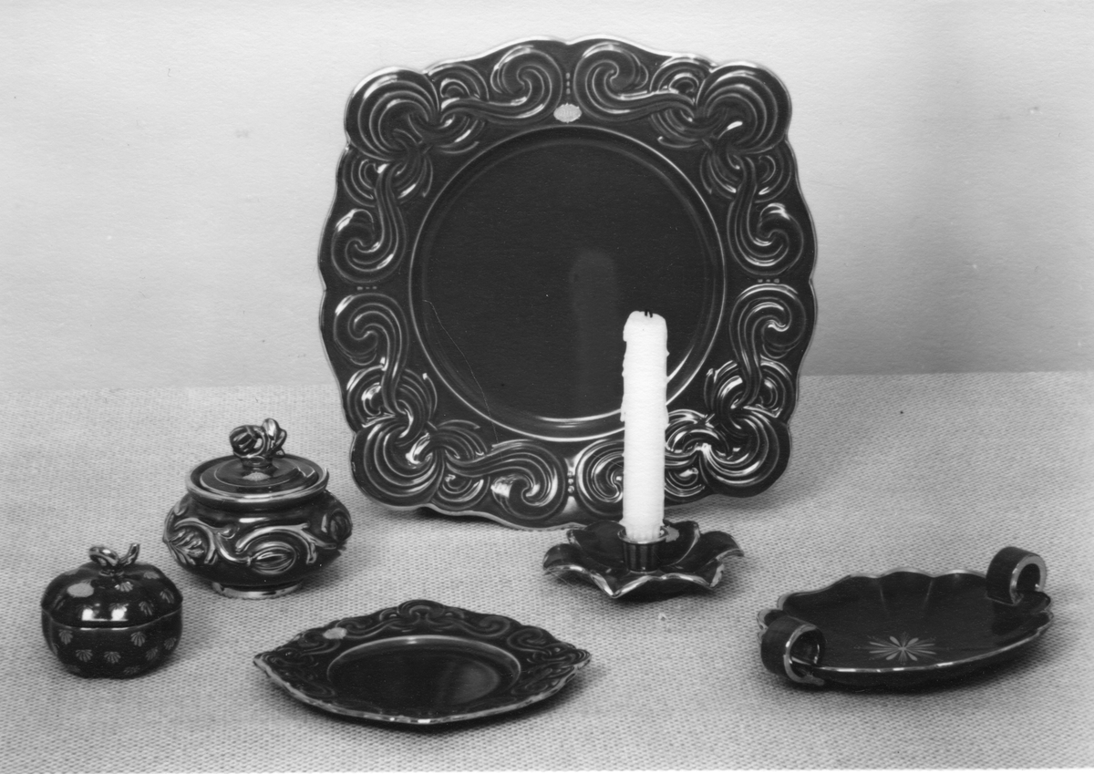 Titel: Dekor "Rubin" Skaparen chefdekoratör EugenTrots var anställd på Gefle Porslin AB 1922-1963. Dekoren som var i produktion 1940-1958, består av handmålade spridda guldornament på bränd rubinröd glasyr. Fruktfat modell AD diameter 31 cm, Ljusstake modell AD höjd 4 cm, Skål med lock modell C, skål modell AO diameter 23 cm, Bonbonjär W-modell höjd 8 cm.