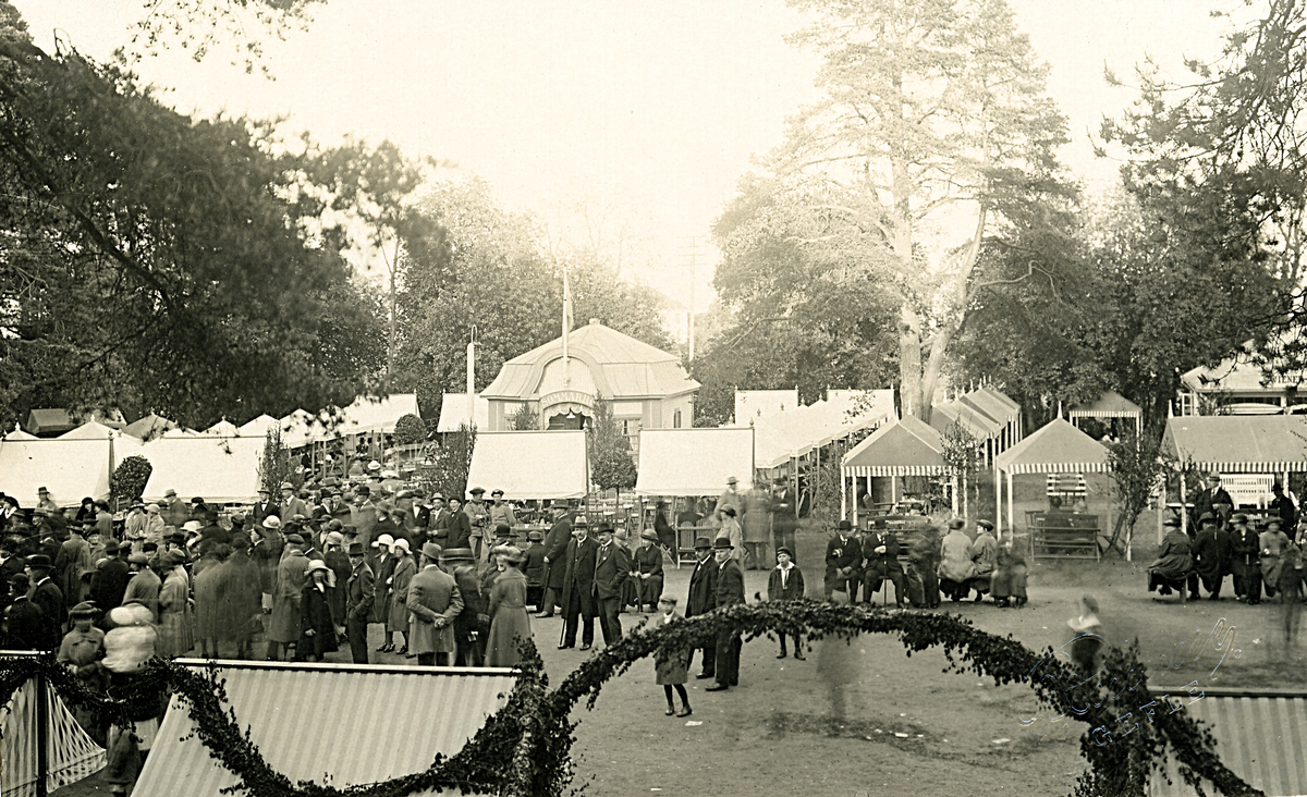 Bild från stadsträdgården i Gävle med café sommarro, Boulognerskogen, i bakgrunden, kanske någon festlig tillställning som äger rum.