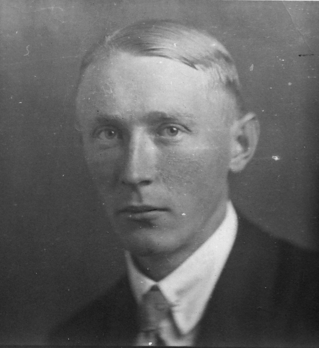 Porträtt av man i halvfigur mot neutral bakgrund. Han är klädd i mörk kavaj, ljus skjorta och slips. Blicken riktad mot kameran. Ateljéfotografi.