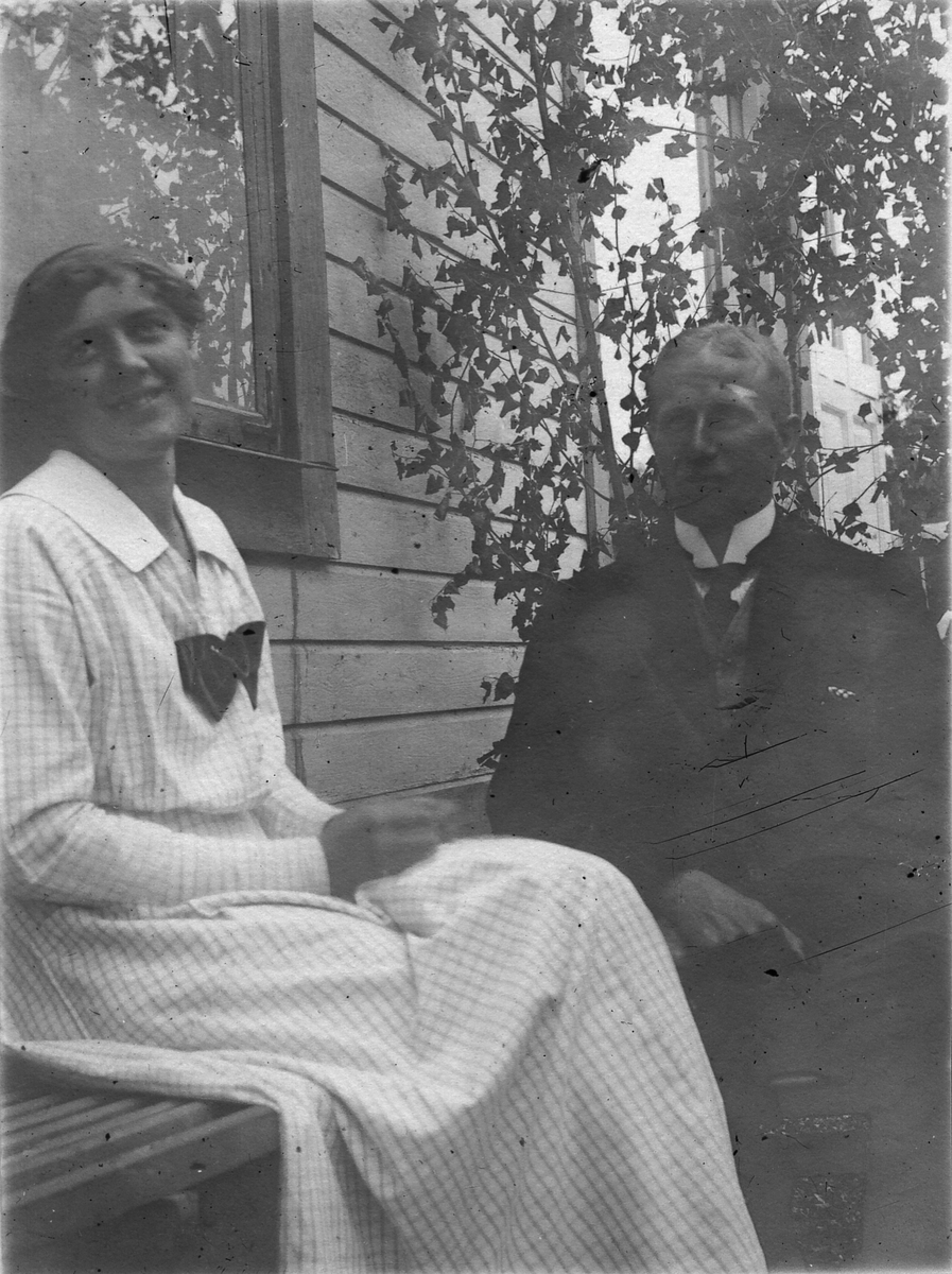 Svartvitt fotografi av en kvinna och en man sittande på en bänk utomhus intill en träbyggnad. Kvinnan bär ljus klänning och mannen mörk kostym. Bakom dem växer klängväxter längs fasaden.