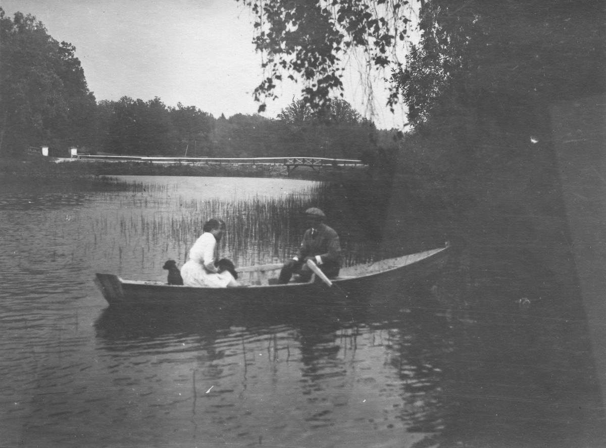 Svartvitt fotografi av tre personer och en hund i en roddbåt på lugnt vatten. En man sitter vid årorna, mittemot en kvinna i ljus klädsel och ytterligare en person. Vass och träd kantar stranden och i bakgrunden syns en bro.