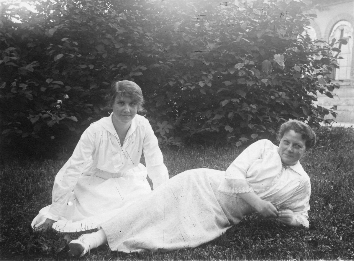 Svartvitt fotografi av två kvinnor liggande i gräset framför en tät buske. En kvinna sitter upp, den andra ligger på sidan. I bakgrunden skymtar en byggnad. Tidigt 1900-tal.