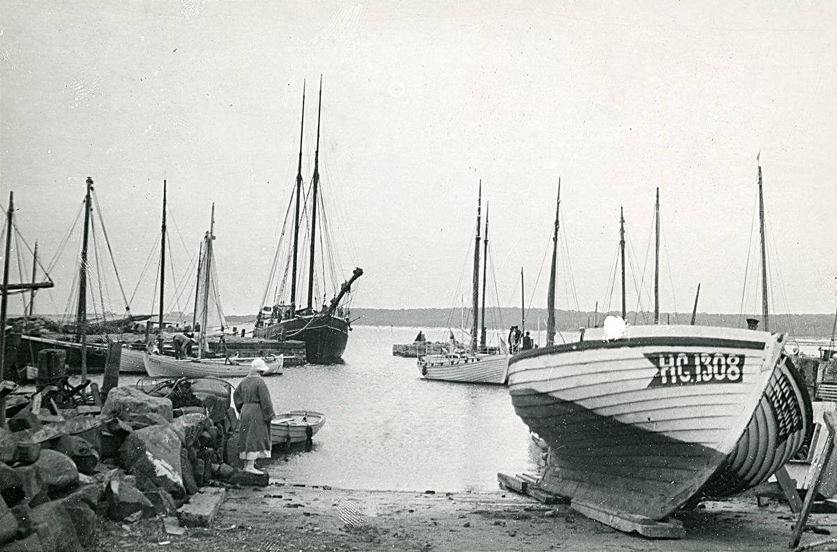 Fiskebåtar förtöjda vid piren i hamnen vid Torekov, Skåne 1922.