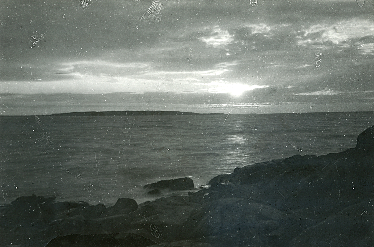 Sol bakom moln samt klippor i förgrunden vid havet i Torekov, Skåne 1922.