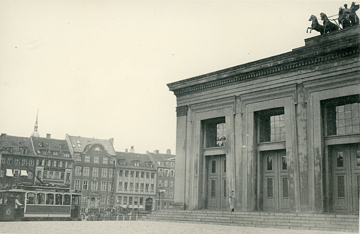 Köpenhamn 1920. Thorvaldsens museum med Quadrigan, en skulpturgrupp föreställande segergudinnan Victoria i en fyrspann, placerad på museéts tak till höger i bild. Till vänster syns en spårvagn samt byggnader.