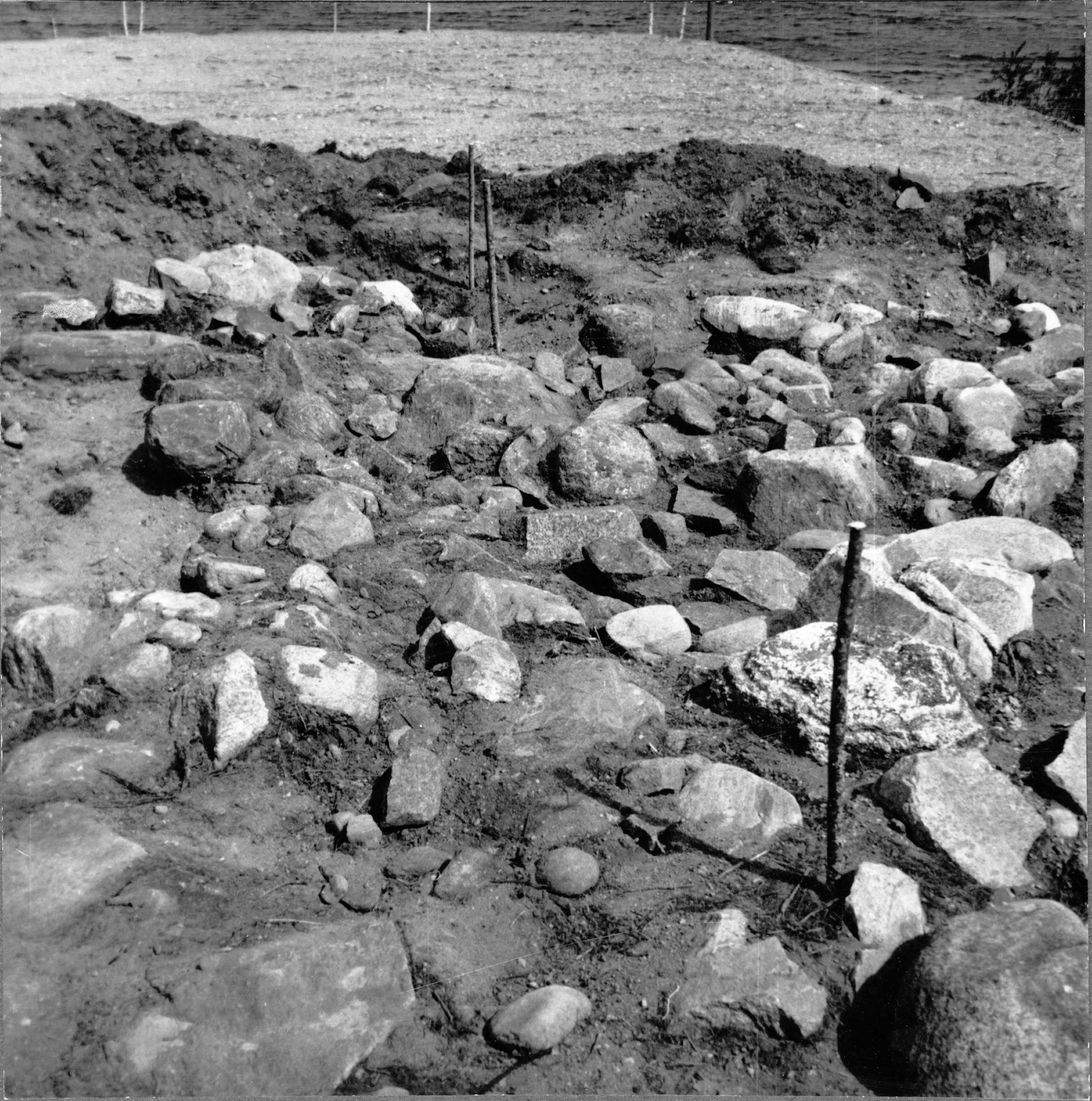 Kyrkans grundmurar under utgrävning. Koret från söder. Triumfbågens öppning till vänster.