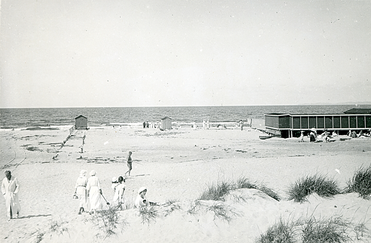 Strand vid Hornbaek, med klassiska badhytter på hjul. Dom var vanliga vid sekelskiftet och en bit in på 1900-talet för att erbjuda badgästerna avskildhet vid ombyte. Danmark 1920.