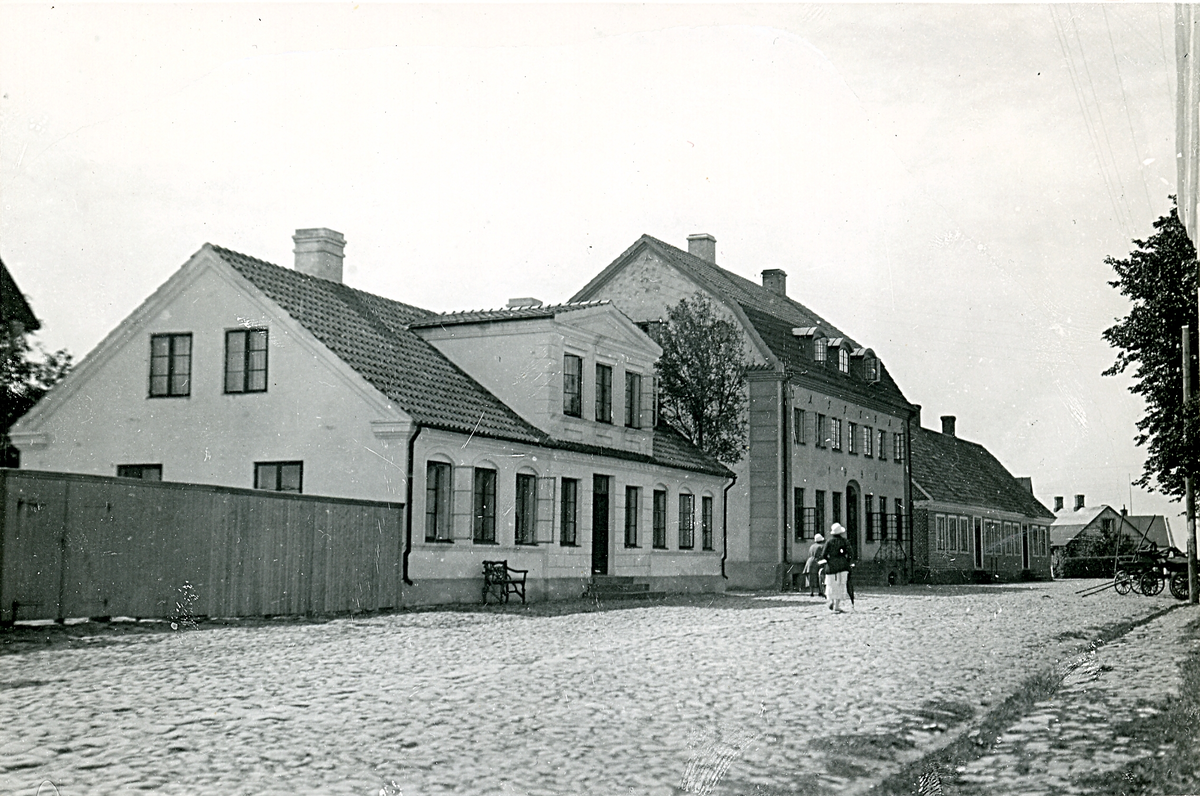 Byggnader som ligger efter en kullerstensgata i Torekov, Skåne 1922.