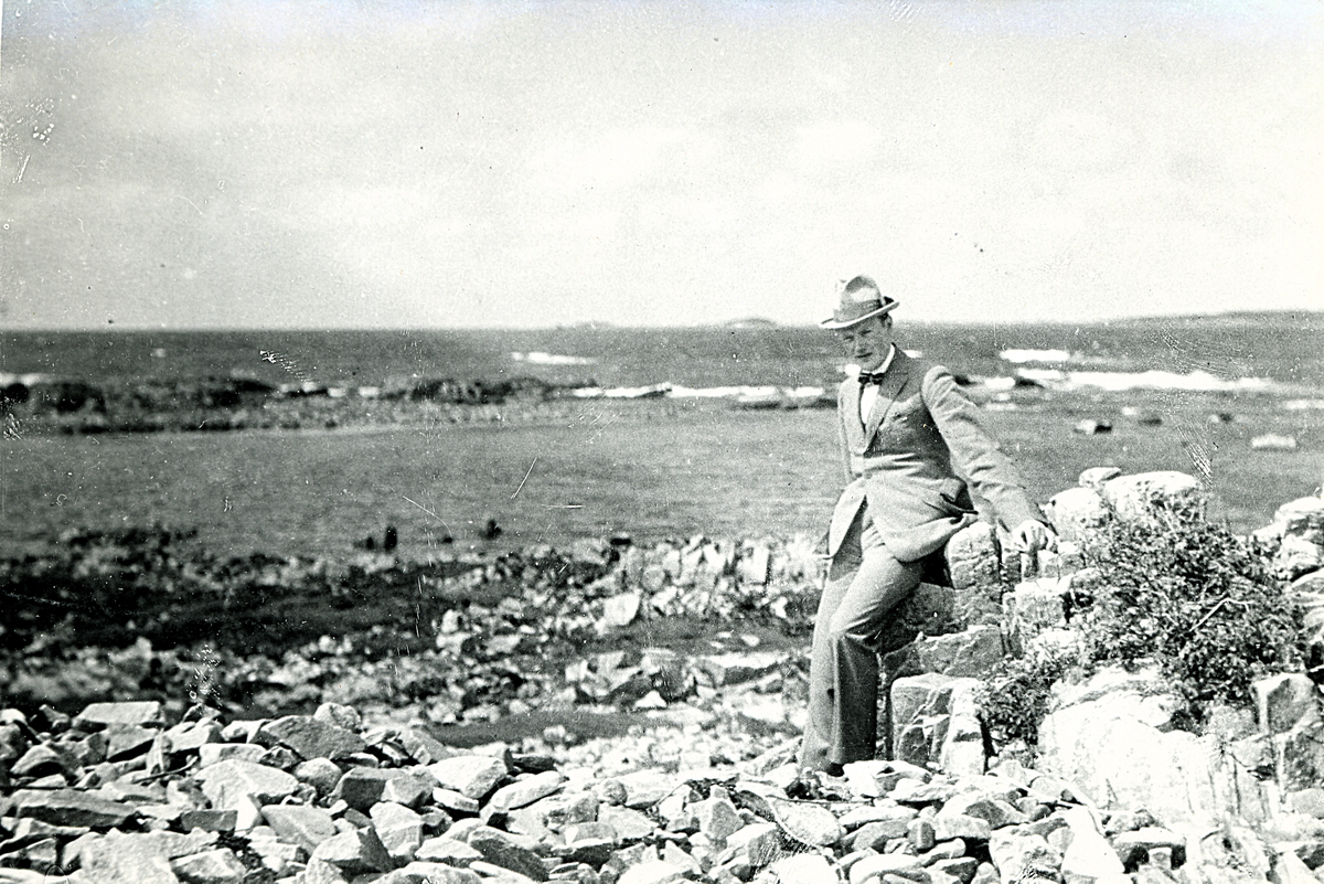 Tandläkare Gunnar Högberg sitter på ett klippblock vid kusten i Torekov, Skåne 1922.