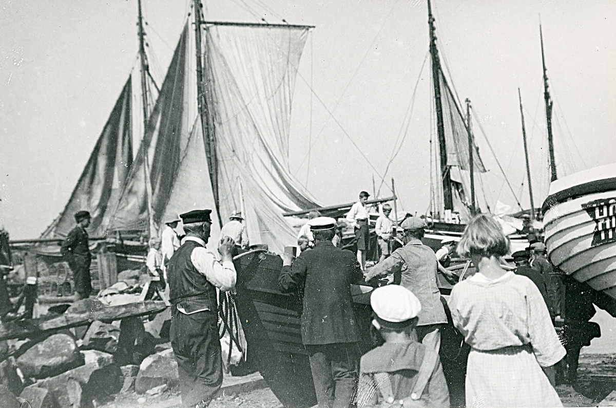 Torekov 1922. Bilden visar en hamn med förtöjda båtar och människor i rörelse, ser ut som de förmodligen skall sjösätta en båt.
