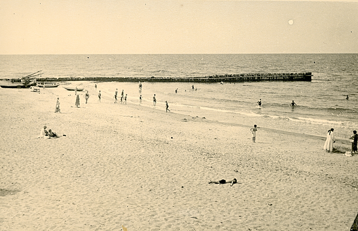 Badgäster vid strand samt en pir som går ut i havet vid Liseleje strand, Danmark 1925.