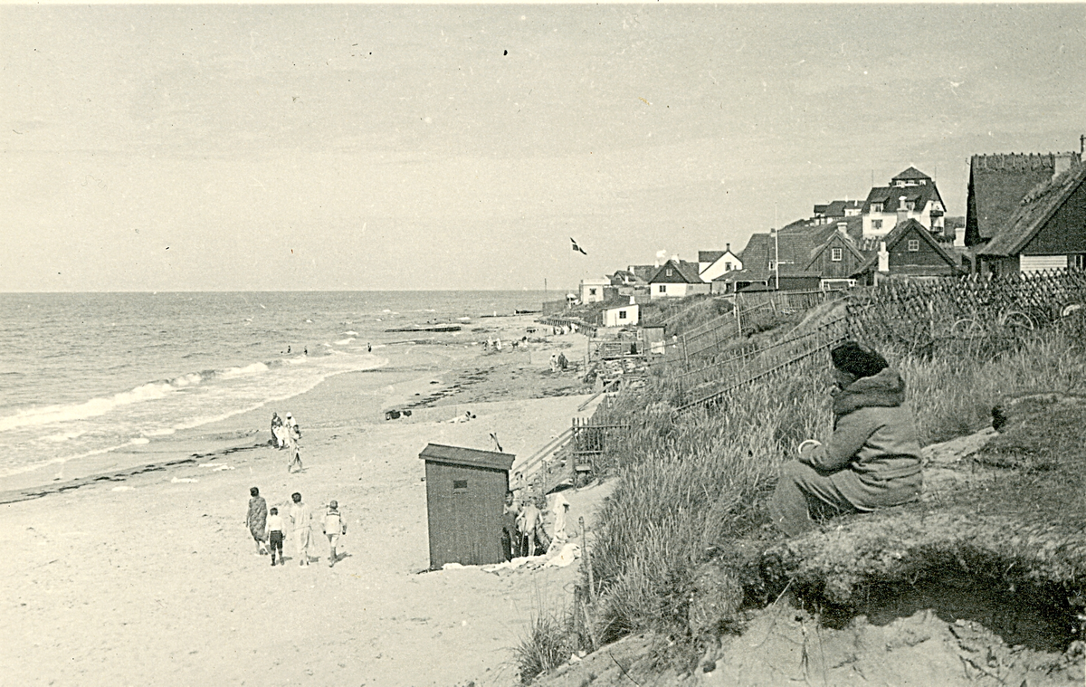 Badort med sandstrand med de ikoniska badhyttorna samt hus som på höjden med sin närhet till havet vid Tisvilde, Danmark 1925.