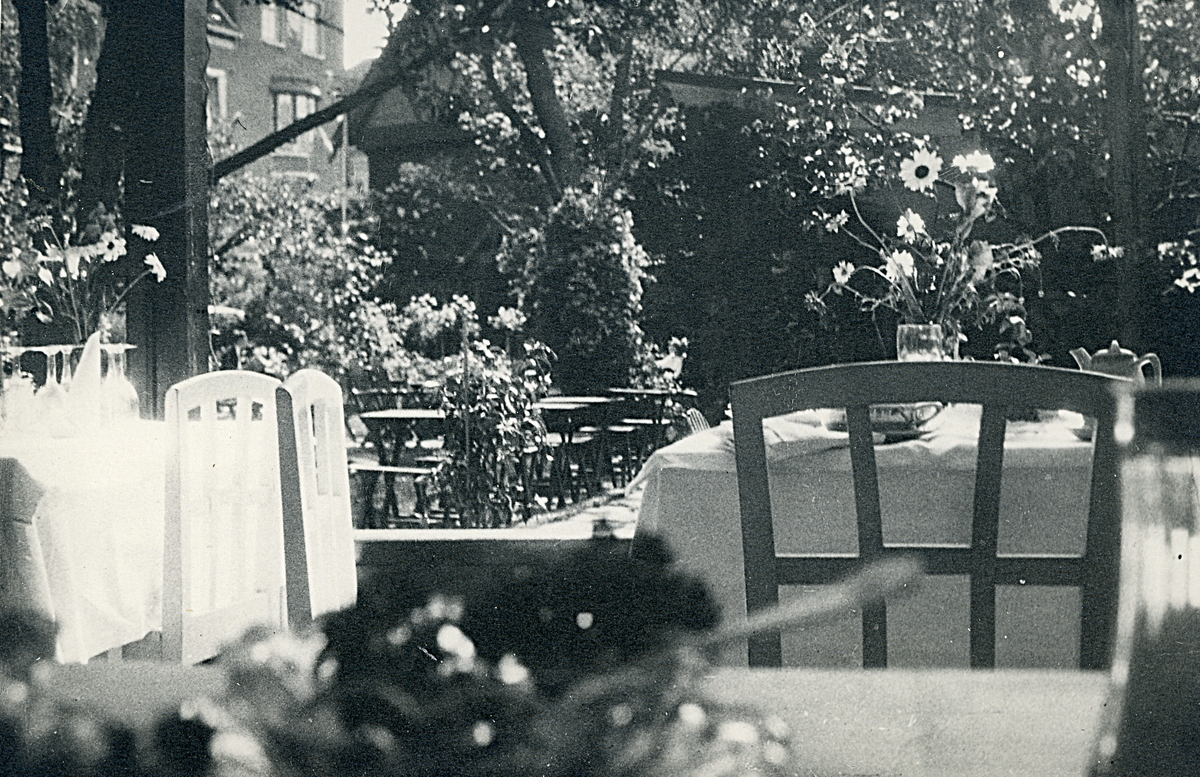 Uteservering i en lummig trädgård någonstans i Visby, Gotland 1927.