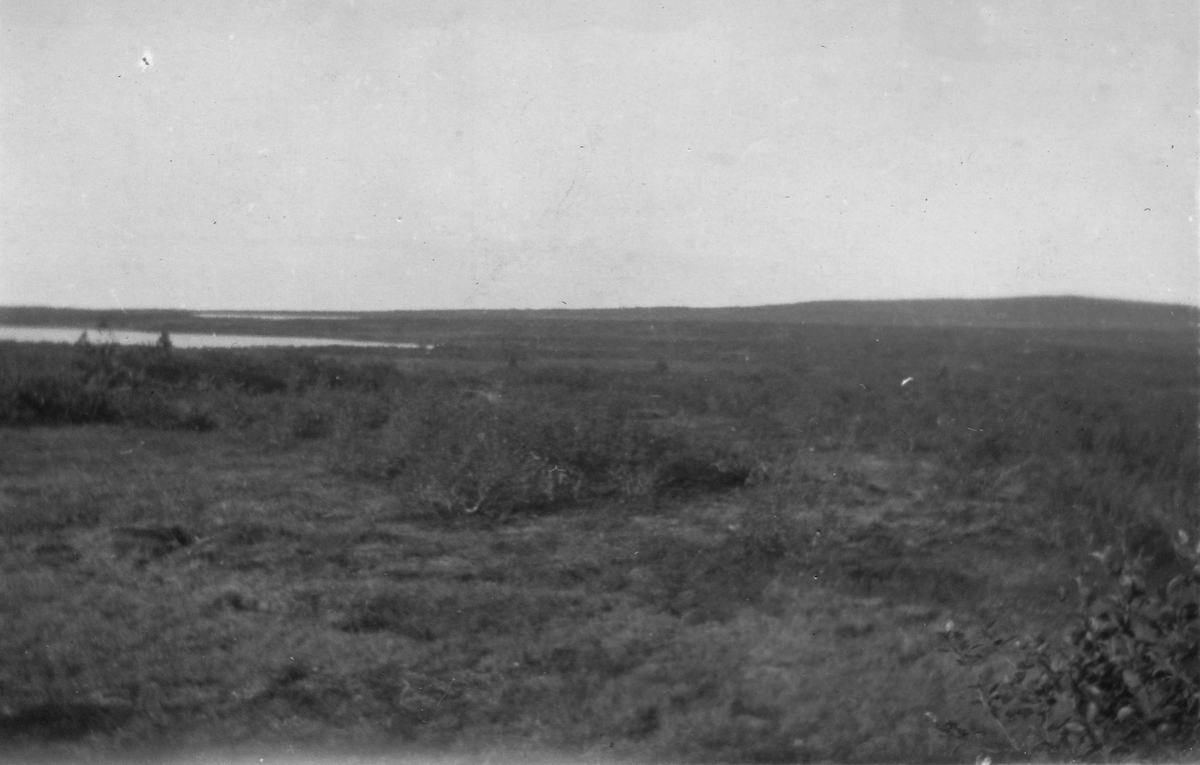 Öppet landskap med låg vegetation. Sjö och skog syns i bakgrunden.