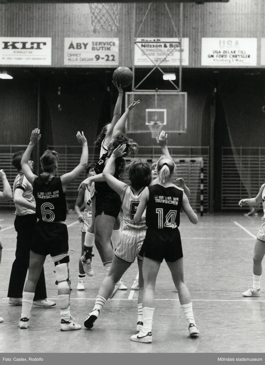Kvarnby Basket spelar match i Mölndals idrottshus/Aktiviteten, år 1988. Motståndarlag och slutresultat är okända.