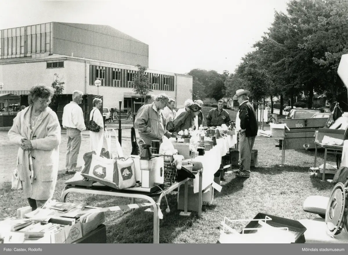 Loppmarknad på Frejaplan i Mölndal, år 1994. Idrottshuset/Aktiviteten i bakgrunden.