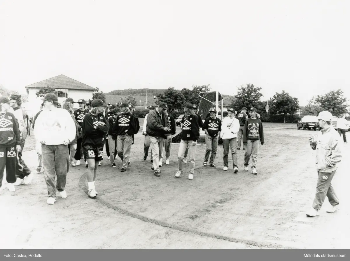 Loppmarknad på Frejaplan i Mölndal, år 1994. Spelare i fotbollslaget Jitex BK går över fotbollsplanen. Fässbergsgymnasiet i bakgrunden.