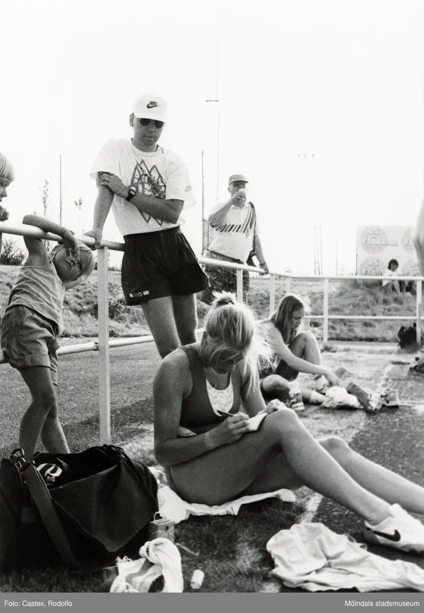 Längdhopparen Erica Johansson från Mölndals AIK, Maik, sitter och skriver autografer. Fotografi taget i början av 1990-talet. Idrottsanläggning okänd.